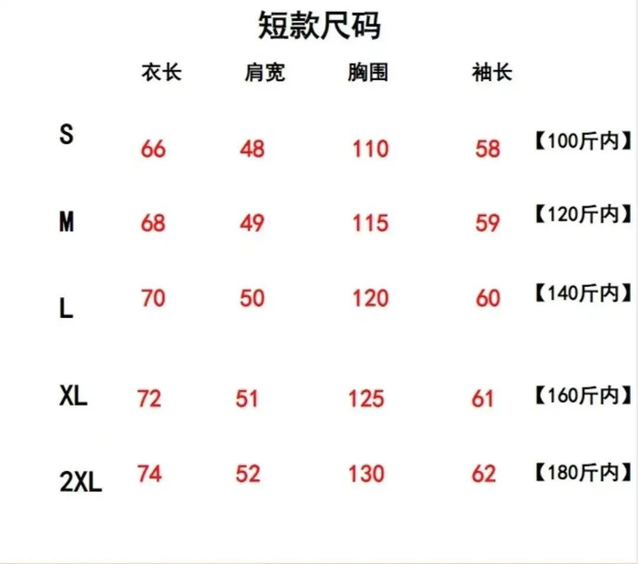 短款充绒量:S235g,M250g,L265g,XL280g ,2XL295g(有上下10g浮动值)