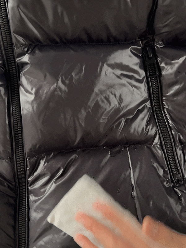 把水喷洒在羽绒服上面,它就跟荷叶一样滴水不沾。