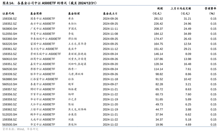 2024年ETF市场中最受瞩目的产品为中证A500ETF,以下列示了截至2024/12/31的中证A500ETF产品的基本信息。其中国泰基金、南方基金、广发基金的中证A500ETF规模均在200亿元以上,另有8只产品的规模在100亿元-200亿元区间,各产品规模之间差距不大。