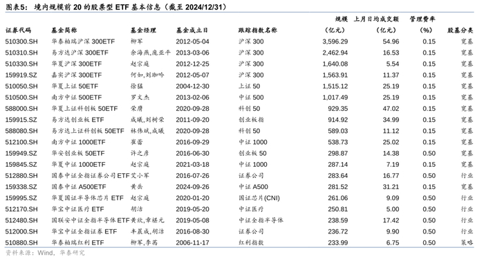 以下是境内规模前20的股票型ETF基本信息,可以看出以宽基ETF为主,另有券商、半导体、医药等行业ETF,一只策略型的红利ETF也跻身前20。