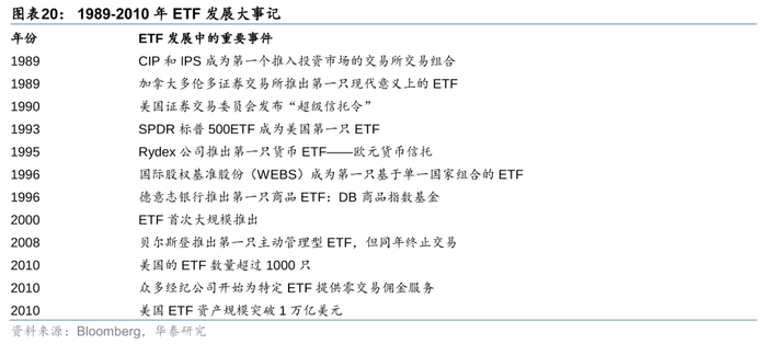 可以看到,ETF的推出一方面缓解了交易所的财务困境,另一方面降低了投资者的成本,同时给基金公司带来了新的商机。在多方共赢的局面下,美国ETF产品类型逐渐丰富,生态圈日益完善,我们将1989-2010年期间ETF发展的重要节点事件梳理如下: