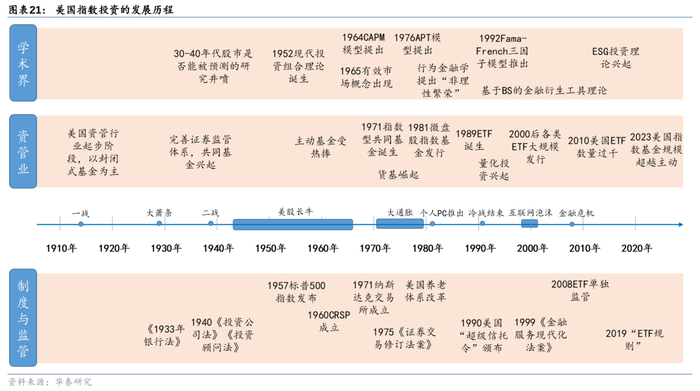 综上我们认为,在海外指数投资和ETF的发展历程中,学术界、资管行业、监管制度都起到了不可或缺的作用。学术界在主被动投资理念之争中贡献了大量的底层研究支持,从现代投资组合理论到有效市场假说的提出,直接将被动投资从理念提升到了理论高度,为被动指数基金的发展提供了坚实的科学基础。美国资管行业的先驱者们破除万难,不断探索创新产品结构、突破制度阻碍,从指数基金到现代意义上的ETF创设,再到当前“万物皆可ETF”的时代,从业者们从无到有地搭建了完整的产品生态,并且顺应时代发展,不断拓宽产品和服务边界,切实解决了投资者的配置需求。美国的监管根据其市场特点,引导长期资金入市,鼓励行业竞争与创新,同时尽可能保障资本市场的长期平稳增长,为ETF市场提供了有序发展的良好土壤。最重要的是,ETF产品凭借其优良的特性,顺应了投资者的配置需求,提高了行业的投资效率,最终成为当前全球最为流行的投资品种。