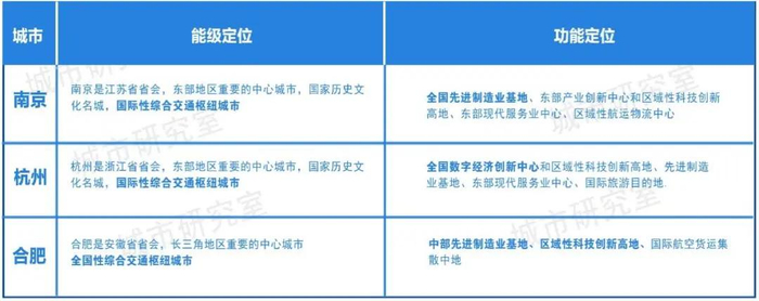 比如和南京、杭州相比,这两个省会城市都是“国际性综合交通枢纽”“全国先进制造业基地”。