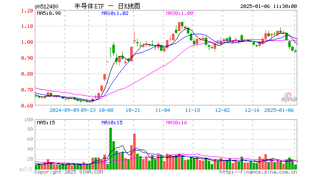 1月6日,截止午间收盘,半导体ETF(512480)跌0.53%,报0.937元,成交额7.87亿元。半导体ETF(512480)重仓股方面,中芯国际截止午盘跌1.54%,北方华创涨0.45%,海光信息跌0.07%,韦尔股份涨0.47%,中微公司涨0.10%,澜起科技跌2.40%,寒武纪涨2.97%,兆易创新跌1.06%,长电科技跌1.60%,紫光国微跌0.22%。