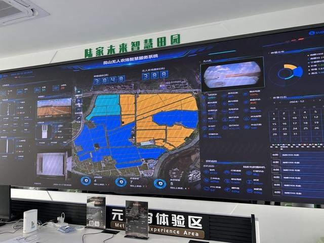 “在这片田里,我们布设了许多农情传感器,收集到的四情数据都能实时传输到系统平台并反馈至大屏上。”在陆家镇“智慧田园指挥决策中心”,中国农业科学院长三角智慧农业研究院的工程师耿博健告诉记者,2021年,苏州市与中国农业科学院签约共建中国农科院华东农业科技中心,陆家未来智慧田园无人农场项目同步落地。无人农场智慧服务系统是整个场景的“智慧大脑”,其中包括了农情监测、农机管理、农资管理、无人机管控等多个模块。“通过这套系统,我们可以让无人机每天自动飞出去代替我们巡田,在指挥室就能让田间闸门开启进行灌溉。智能农机也省了很多事情。耕播机可一次性完成旋耕、播种作业;收割时机器直接监测谷物破碎率、含杂率,从而提高作业质量;收获的稻麦可通过运粮车直接送到农场烘干中心进行烘干入库……无人装备已覆盖稻麦生产过程中耕种管收的每一个环节,而且让生产作业更加便捷、高效。”