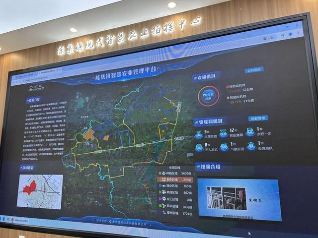在园区的现代智慧农业指挥中心大屏上,各田块被不同颜色标记,左侧空气湿度、光照强度等小气候环境数据和土壤湿度、墒情等数据实时更新,右侧大田、大棚和果园里的设备可实时控制。“现在,农场使用的植保机、拖拉机、插秧机都是无人驾驶的,人在室内操控,机器就能在田间作业形成轨迹。你看,点一下按钮,出水口自动打开灌溉,指令能精准下到某一台机器上。”陈集镇现代农业园区党支部书记陈朝云边点击鼠标边演示。