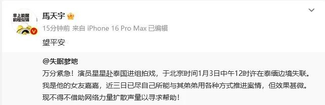 1月5日深夜,微博账号“失眠爹地”发文,自称“嘉嘉”,其男友“星星”是一名演员,日前赴泰国拍戏,在北京时间1月3日中午于泰缅边境失联。