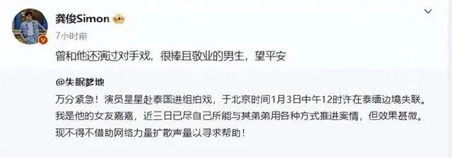 6日凌晨,演员@龚俊Simon转发微博发声:曾和他还演过对手戏,很棒且敬业的男生,望平安。