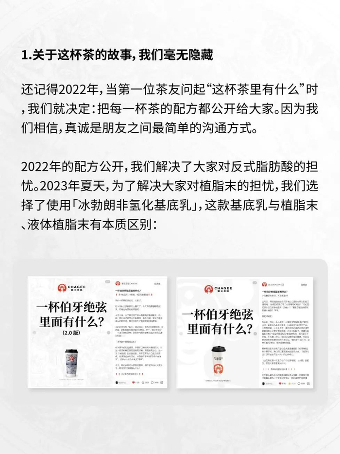 在《每一杯茶的安全透明,都是我们坚守的承诺》的官方回应中,霸王茶姬再次回顾、梳理了其产品成分,也正面回应了测评博主对包括其在内的奶茶行业的质疑:没有“科技狠活”,放心喝,将继续保持健康化、透明化。