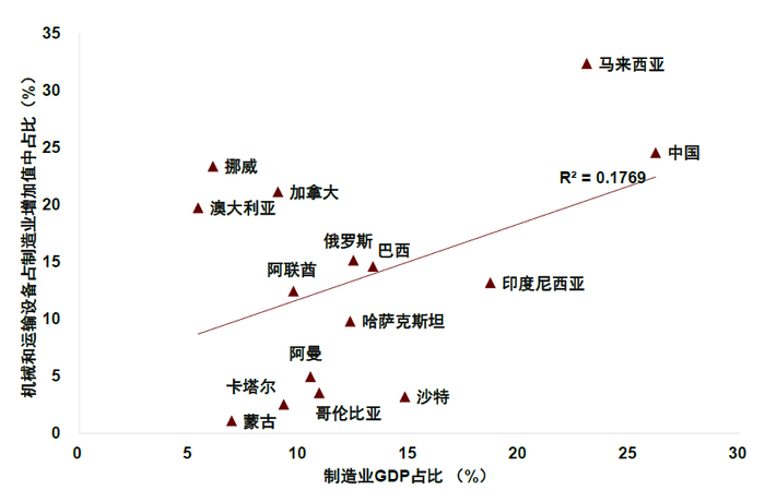 图表4:油气资源国制造业GDP占比、机械交通运输设备在制造业中占比(2023)