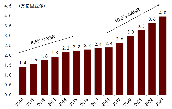 2023年沙特成为全球旅游的热门目的地之一,提前完成1亿人次的旅游业发展目标。根据沙特旅游部数据,2023年沙特接待了2740万人次境外游客,较上年同比增长65%;接待本国游客7930万人次,较上年同比增长5%;当年接待境内外游客总计1.09亿,提前实现“2030愿景”设定的1亿人次游客的目标。2023年沙特境内外游客的消费额超2500亿里亚尔(折合670亿美元),占沙特当年GDP的4%以上、占非石油GDP的7%以上。鉴于旅游业的快速增长趋势,沙特旅游部于2023年10月将旅游战略发展目标提高至“到2030年每年接待1.5亿人次游客”。