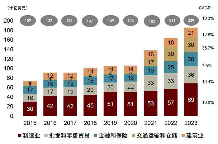 2016年以来FDI净流入增速最快的行业包括交通运输、建筑、制造业、商贸零售、金融保险。根据沙特投资部数据,截至2023年,制造业FDI存量总额690亿美元,2016年以来复合增速10.8%;商贸零售、金融保险、交通运输、建筑业FDI存量分别达360亿美元、299亿美元、297亿美元、210亿美元,2016年以来复合增速分别达10.4%、7.5%、35.7%、12.6%。