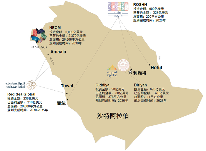 Giga项目的目标是创建一个新的生态系统,将沙特发展成为世界上最受欢迎的旅游目的地之一。Giga项目旨在通过塑造新的生态系统促进经济增长,促进新兴产业发展,实现经济多元化增长,降低经济对传统原油产业的依赖,实现经济结构调整,促进固定资产投资增长,实现中长期投资回报。五个Giga项目NEOM、ROSHN、Red Sea Global、Qiddiya和Diriyah,项目总预算6854亿美元,截至2024年1季度,已签约项目资金总额约3365亿美元。