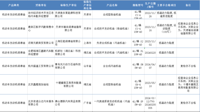 2. 标称天津市增尚润滑油脂有限公司生产的合成技术发动机油(柴油机油),不合格项目为:低温动力黏度,运动黏度(100℃),备注:经查询企业信息公示系统,关联企业为:天津增尚润滑油脂有限公司。