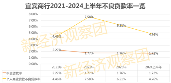 过去三年间,宜宾商行的整体不良贷款余额经历了不小的波动——从2021年的8.04亿元降至2022年的7.73亿元,又回升至2023年的9.04亿元——其不良贷款率分别达到了2.27%、1.77%和1.76%,进入2024上半年,这一数值再度回落至1.72%,虽然不良贷款率持续有所下滑,但仍然要高于全国商业银行同期平均值1.56%。