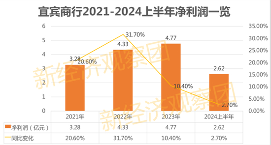 不过在飞速发展的同时,宜宾商行近来也陷入了业绩增长瓶颈。进入2024年后,情况变得更加复杂。上半年结束时,宜宾商行仅实现了10.78亿元的营业收入与2.62亿元的净利润,相较于去年同期,这两个关键财务指标的增长幅度分别仅为0.2%和2.7%,营收、净利润增速双双放缓。