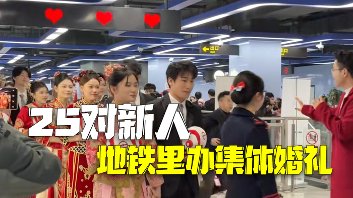 江苏南通地铁为25对新人在地铁站办集体婚礼,新人们从和平桥站出发乘坐列车前往幸福站,幸福感满满。南通地铁客服称,每对新人中至少一位是地铁员工,活动很有纪念意义。