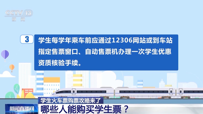 国铁南昌局厦门北站客运值班站长 吴振斌:现在中国高等教育学生信息网和铁路12306系统已实现信息对接,学生旅客每学年乘车前可通过铁路12306App在线办理学生优惠资质核验手续。