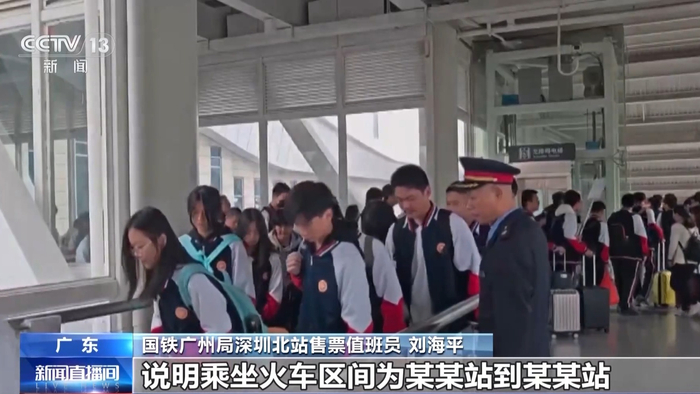 国铁广州局深圳北站售票值班员 刘海平:已满14周岁的中学生需要购买学生票返乡,需要学校开具学籍证明,注明家庭地址,说明乘坐火车区间为某某站到某某站,加盖学校公章,但是要去车站人工窗口办理。
