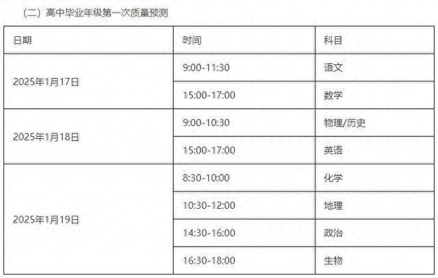 其中,高中毕业年级第一次质量预测具体安排为:1月17日上午9:00~11:30语文,下午15:00~17:00数学;1月18日上午 9:00~10:30物理/历史,下午15:00~17:00英语;1月19日上午8:30~10:00化学、10:30~12:00地理,下午14:30~16:00政治、16:30~18:00生物。