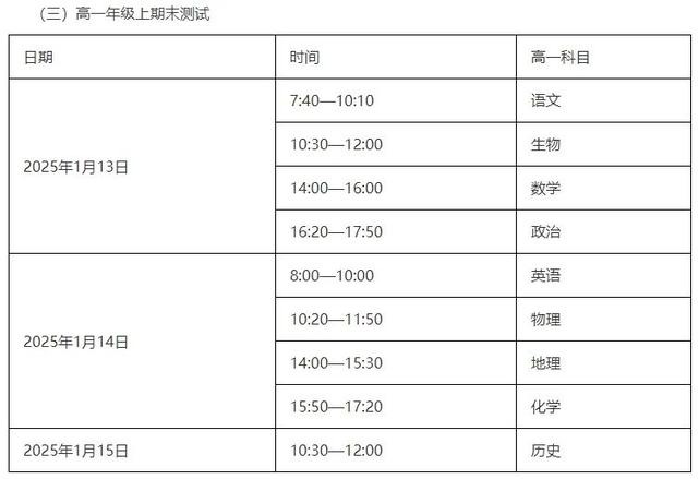 高一年级期末测试具体安排为:1月13日上午7:40~10:10语文、10:30~12:00生物,下午14:00~16:00数学、16:20~17:50政治;1月14日上午8:00~10:00英语、10:20~11:50物理、下午14:00~15:30地理、15:50~17:20化学;1月15日上午10:30~12:00历史。