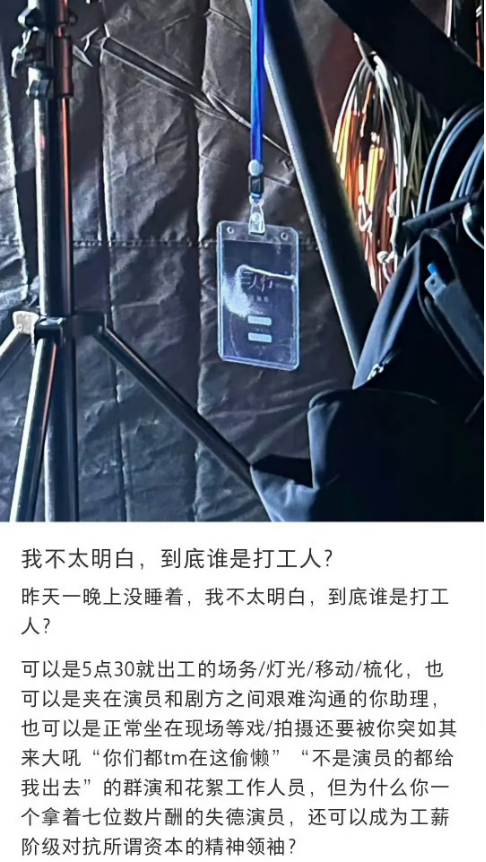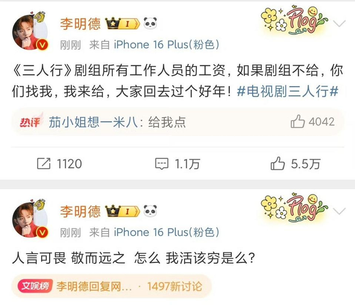 还有《三人行》剧组工作人员发声质问“到底谁才是打工人”:因为李明德的无故失联导致全剧组进度停滞,“为什么你一个拿着七位数的失德演员,还可以成为工薪阶层的精神领袖?”