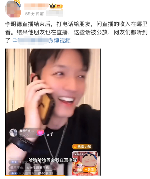 直播结束后他打电话给朋友,问直播收入在哪里看,而他的朋友没有下播,这些话被公放出来。