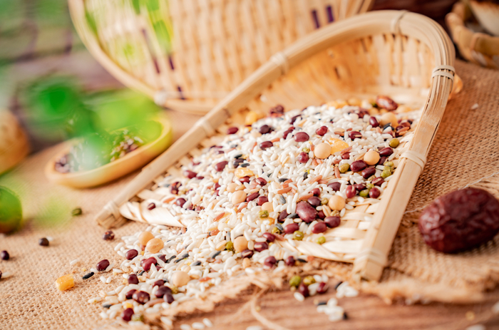 在食材搭配上,建议在白米等精细食材的基础上,适当搭配一些糙米类、杂粮类等谷物。粗细搭配既可以增强口感,又有利于摄取更丰富的营养物质。豆类富含蛋白质、膳食纤维、维生素和矿物质,并含有丰富的赖氨酸,与大米等谷物搭配起来可形成有效的营养互补。同时,适量添加坚果类和干制果蔬类食材,不仅可以丰富营养,还可以调节口味,但如果是给老人及儿童食用,建议提前取出食材中的硬核。