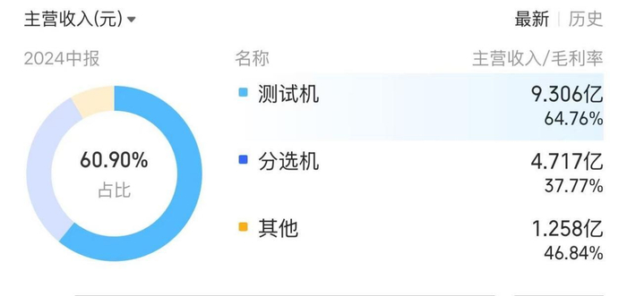 在此背景下,长川科技的测试机、分选机等主要产品营收均迎来跳跃式增长。其中,毛利率达64.76%的测试机在营收中的占比由2023年的32.97%,大幅增长到今年上半年的60.9%,占据了长川科技近72%的利润来源。