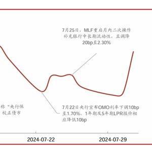 但7月中下旬,二季度基本面数据趋弱,年内首次降息落地。7月22日央行便宣布OMO利率下调10bp至1.70%,1年期及5年期LPR报价相应降低10bp至3.35%、3.85%。7月25日,MLF重启月内二次操作补充银行中长期流动性,且调降20bp至2.30%。此外,月末周通过逆回购累计净投放9847.5亿元,OMO公告措辞也从“维护月末银行体系流动性平稳”转变为“维护月末银行体系流动性合理充裕”,从平稳转变为合理充裕体现了央行呵护资金面的态度。在一系列宽货币举措和央行投放的呵护之下,7月末资金面明显转松,R001从2.0%的高位快速下行至1.7%左右。