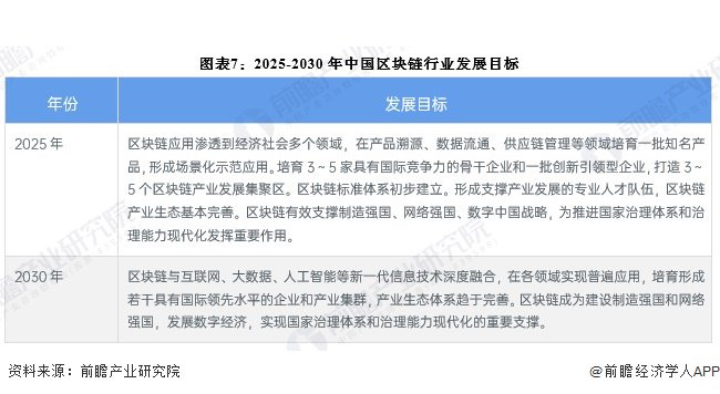 根据中国工业和信息化部、中央网络安全和信息化委员会办公室共同发布的《关于加快推动区块链技术应用和产业发展的指导意见》,到2025年,区块链产业综合实力达到世界先进水平,产业初具规模;到2030年,区块链产业综合实力持续提升,产业规模进一步壮大。
