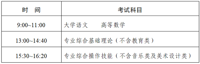注:教育类专业综合基础理论考试时间:13:00-15:00;美术设计类专业综合操作技能考试时间:15:30~18:00。音乐类专业综合操作技能考试时间安排见另行公布的现场测试方案。