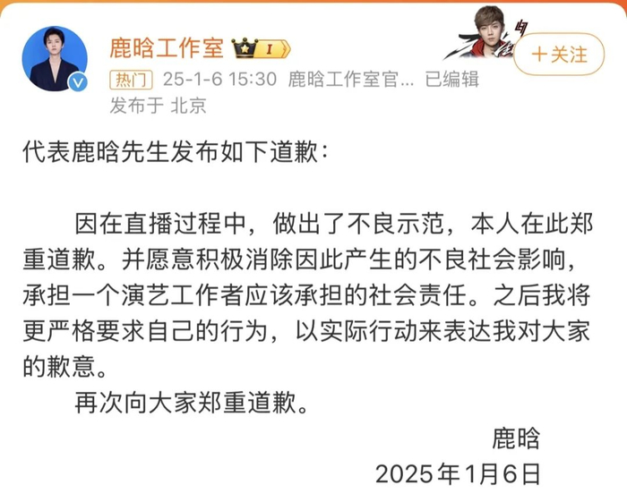 #鹿晗社交平台被禁止关注##鹿晗发文道歉#相关话题接连霸屏热搜。