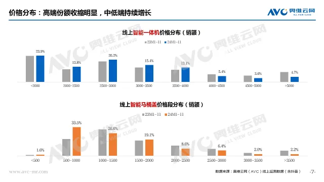 从价格分布来看,智能坐便器市场目前呈现出高端份额收缩、中低端持续增长的局面。2024年1-11月线上智能一体机价格分布中,2000元以下、2000-2500元、2500-3000元、3000-3500元的销额占比分别达到23.9%、13.8%、20.2%和15.4%。在智能马桶盖的价格分布中,低端增长趋势更加明显,500-1000元的销额占比快速提升至33.5%。