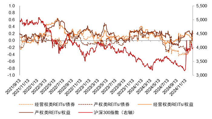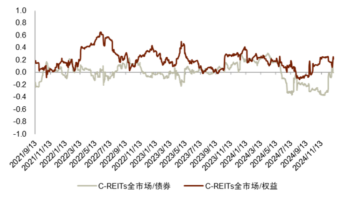 注:1)REITs与债券及权益的关系分别采用中债综合全价指数、沪深300指数计算;2)数据截至2024年12月31日