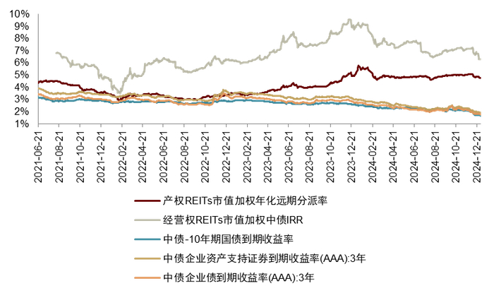 关注利差边际变化。我们统计12月底产权REITs市值加权远期分派率为4.76%,虽环比下降31bps,但与十年期国债收益率利差环比仍走阔5bps;经营权REITs市值加权中债IRR为6.30%,环比下降84bps,与十年期国债收益率利差环比收窄49bps。