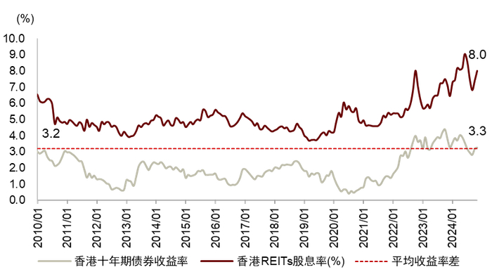 图表37:中国香港REITs股息率与香港政府十年期债券收益率对比