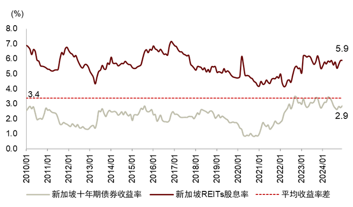 图表39:新加坡REITs股息率与新加坡政府十年期债券收益率对比