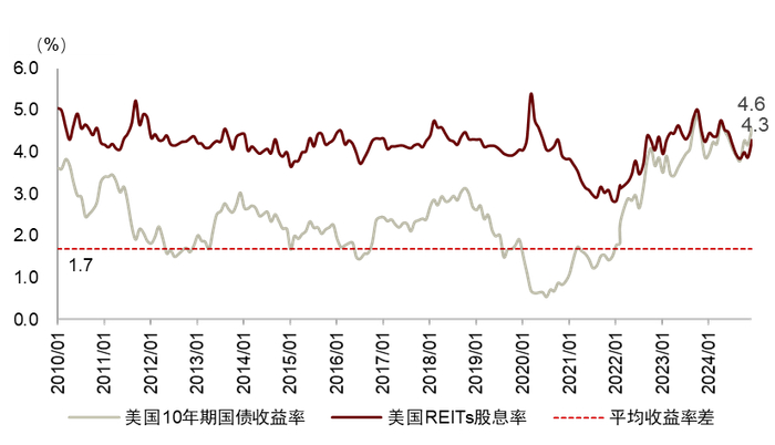 图表33:美国REITs股息率与美国十年期国债收益率对比