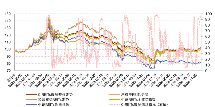 注:1)为了方便对比,我们对中证REITs价格指数及中证REITs全收益指数进行起始日期标准化调整;2)数据截至2024年12月31日;3)C-REITs市场情绪指标根据我们2023年3月24日发布的《公募REITs市场情绪初探》中描述的模型计算,并剔除了所有项目上市首日的换手数据