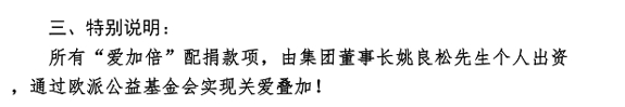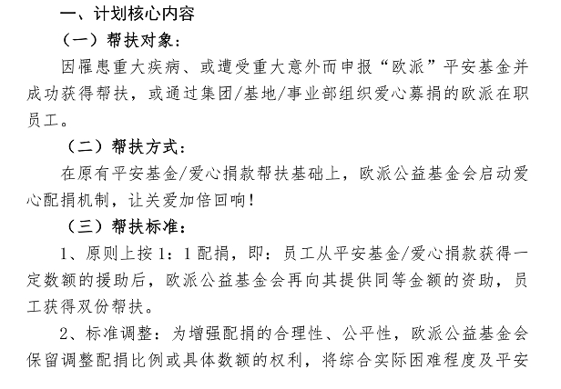 然而,欧派家居并未随波逐流,而是坚守企业公民责任,持续投入公益事业,用实际行动传递温暖。2024年12月18日,欧派发布《欧派公益基金会实施“爱加倍”配捐工作的通知》,表示“爱加倍”配捐工作旨在帮扶因重大疾病或意外而需要援助的员工,欧派公益基金会在员工通过内部平安基金或爱心捐款获得帮助的基础上,再追加等额资助,真正实现关爱叠加的效果。
