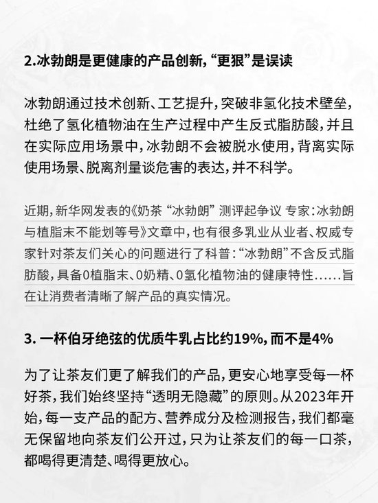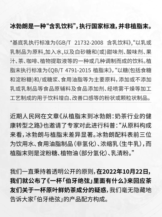 对此,霸王茶姬指出,“冰勃朗是一种‘含乳饮料’,执行国家标准,并非植脂末。冰勃朗通过技术创新、工艺提升,突破非氢化技术壁垒,杜绝了氢化植物油在生产过程中产生反式脂肪酸,并且在实际应用场景中,冰勃朗不会被脱水使用,背离实际使用场景、脱离剂量谈危害的表达,并不科学。”