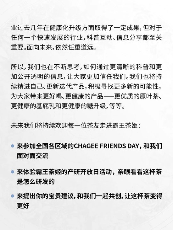 实际上,早在2022年,霸王茶姬就公布了其明星产品“伯牙绝弦”的成分构成,并于2023年对产品成分进行了健康化升级。在这次回应中,霸王茶姬再次回顾、梳理了其产品成分,回应了用户的担忧:没有“科技狠活”,放心喝,将继续保持健康化、透明化。