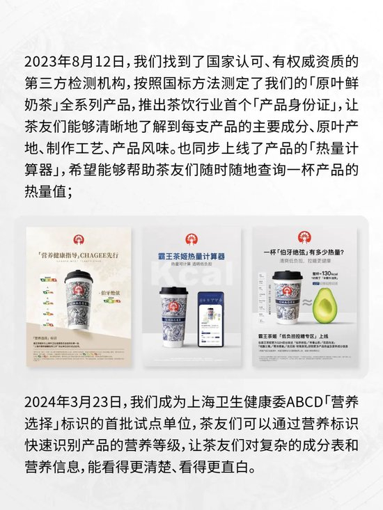 风波背后透露出的是,以粉末冲泡、植脂末(“奶精”)为主的奶茶1.0时代,给用户留下的“奶茶不健康”的印象仍然非常深刻。为此,不少奶茶品牌近年来推动产品的透明化。2024年,霸王茶姬还公布了产品的热量值、GI值,并在上海卫健委指导下,推行奶茶的ABCD分级,让一杯奶茶的“身份证”信息越来越透明。2023 年 10 月,喜茶公开所有在售产品配方、营养成分和原料溯源信。茶百道则推行了QTS质量溯源项目,旨在搭建茶饮行业首个原料防伪溯源平台,实现供应链管理的数字化、可视化、智能化。