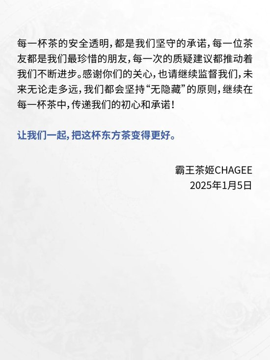1月5日,霸王茶姬在其官方渠道发布了《每一杯茶的安全透明,都是我们坚守的承诺》,通过问答形式解答了行业有关“冰勃朗”疑惑。