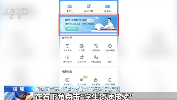 国铁南昌局厦门北站客运值班站长 吴振斌:现在中国高等教育学生信息网和铁路12306系统已实现信息对接,学生旅客每学年乘车前可通过铁路12306App在线办理学生优惠资质核验手续。