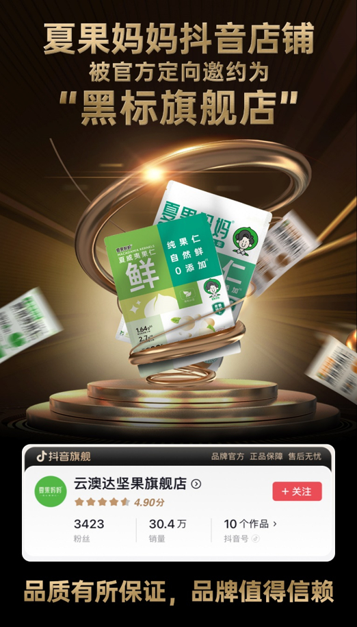 借助抖音直播间,“夏果妈妈”品牌声量正在不断放大。目前,品牌在抖音商城“坚果零食人气榜”、“夏威夷果爆款榜”名列前茅,全平台曝光超5亿+,复购率30%+。去年12月27日,陈榆秀还代表“夏果妈妈”,赴北京参加抖音电商举办的“直播促消费,商家共发展”发布会,分享品牌携手抖音电商的成长故事。