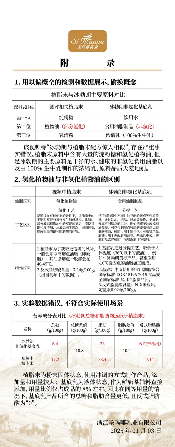 1月3日,冰勃朗背后公司圣吗哪乳业发布声明,称冰勃朗非氢化基底乳的主要原材料是饮用水、非氢化食用油脂以及生牛乳制作的浓缩乳,与植脂末是两种完全不同的食品原料;并且两者成分测试结果也截然不同。