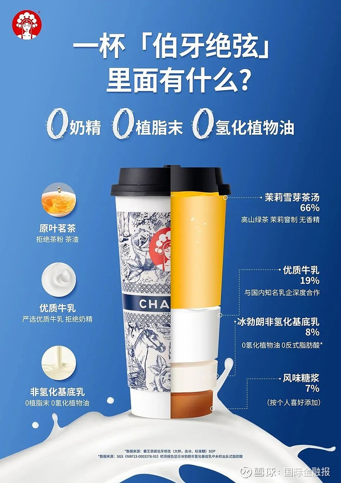 如今,一杯伯牙绝弦里含有约66%的新鲜现泡的原叶茶汤;约19%是来自新希望、味全等知名品牌的优质牛乳;约8%是创新工艺的冰勃朗非氢化基底乳;约7%是可以按喜好选择的风味糖浆。