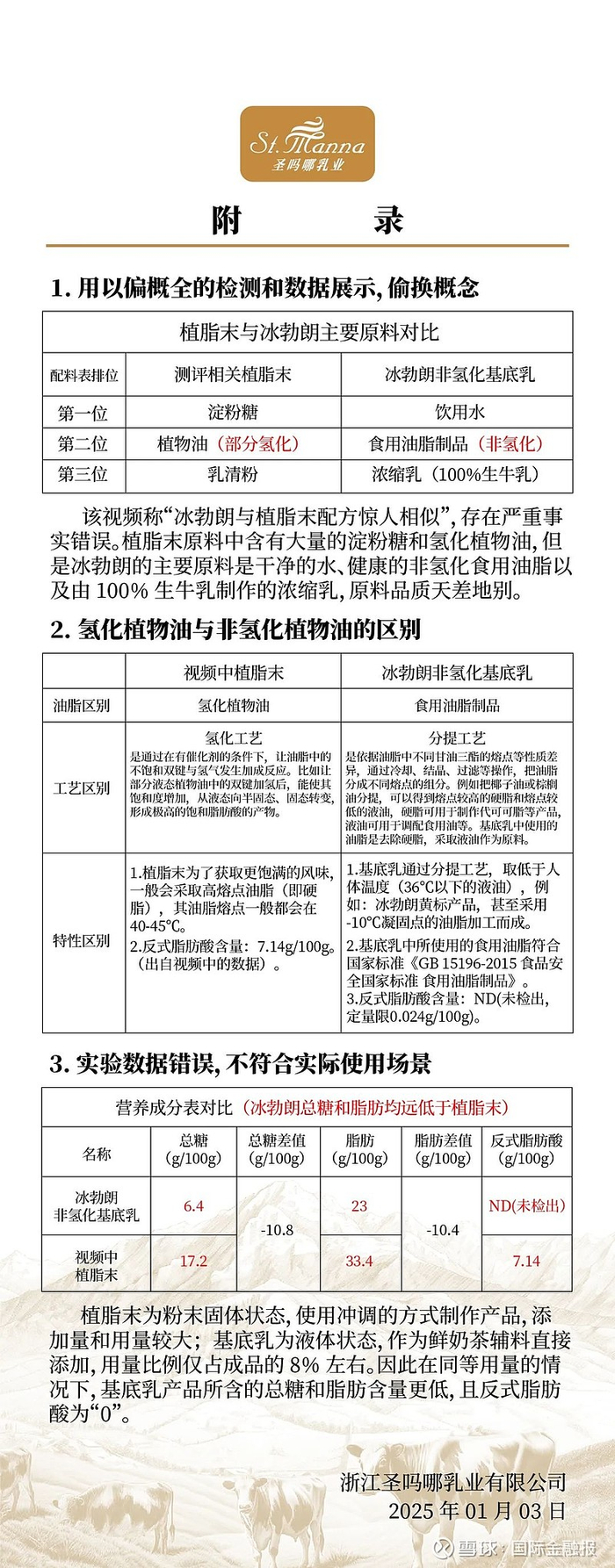 1月3日,冰勃朗背后公司圣吗哪乳业发布声明,称冰勃朗非氢化基底乳的主要原材料是饮用水、非氢化食用油脂以及生牛乳制作的浓缩乳,与植脂末是两种完全不同的食品原料;并且两者成分测试结果也截然不同。